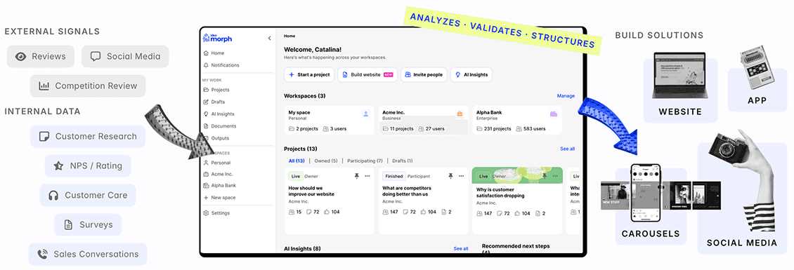Our Morph AI aggregates multiple sources of information, from customer reports, competition analysis to objectives and branding, to build a document that will be used to build a functional website, for example. All without you having to bother about technical skills, hire an agency or developers.