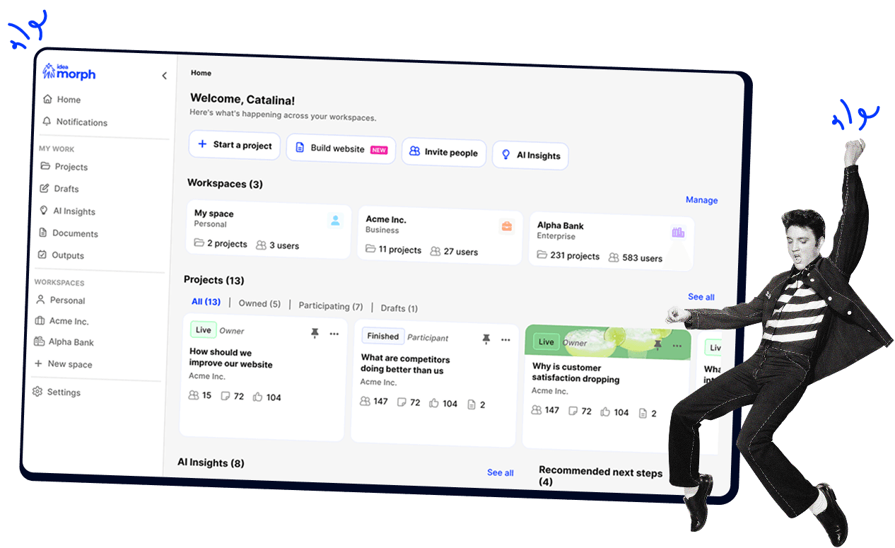 Idea Morph's AI reads across all your data - aggregated sources and discovery project responses - and produces structured insight reports. Recurring problems. Emotional drivers. Opportunity gaps. Ranked by signal strength, not gut feel.