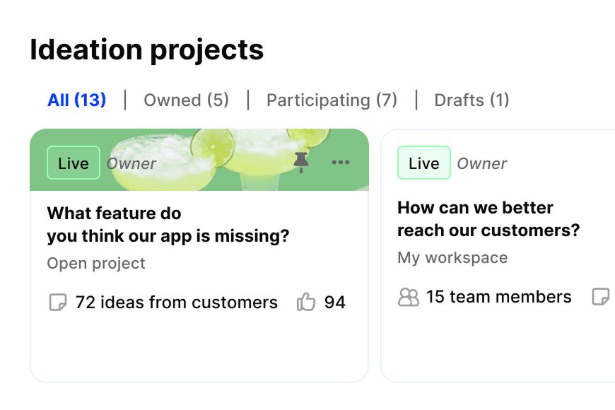 Ask open questions to uncover unmet needs. Run ideation sessions to generate solutions. Invite customers to contribute ideas, answer discovery questions, and tell you in their own words what they want built.